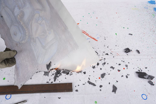 Aan dit doek werd verder gewerkt: de twee eerste tekeningen die ik gebruikte voor het project Benoemens-waardvlinders zijn definitief op het doek aangebracht. De overschotten werden verbrand; de assen zijn als één strook onderaan het doek toegevoegd. Het idee verschuift daarbij richting vlammen: de tekeningen zijn zo uitgeknipt dat een vuurachtige vorm zichtbaar wordt.