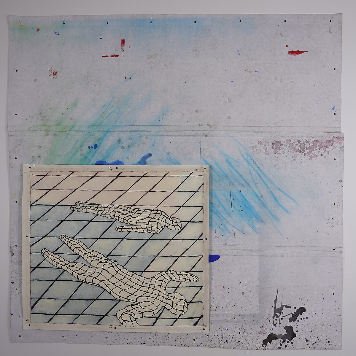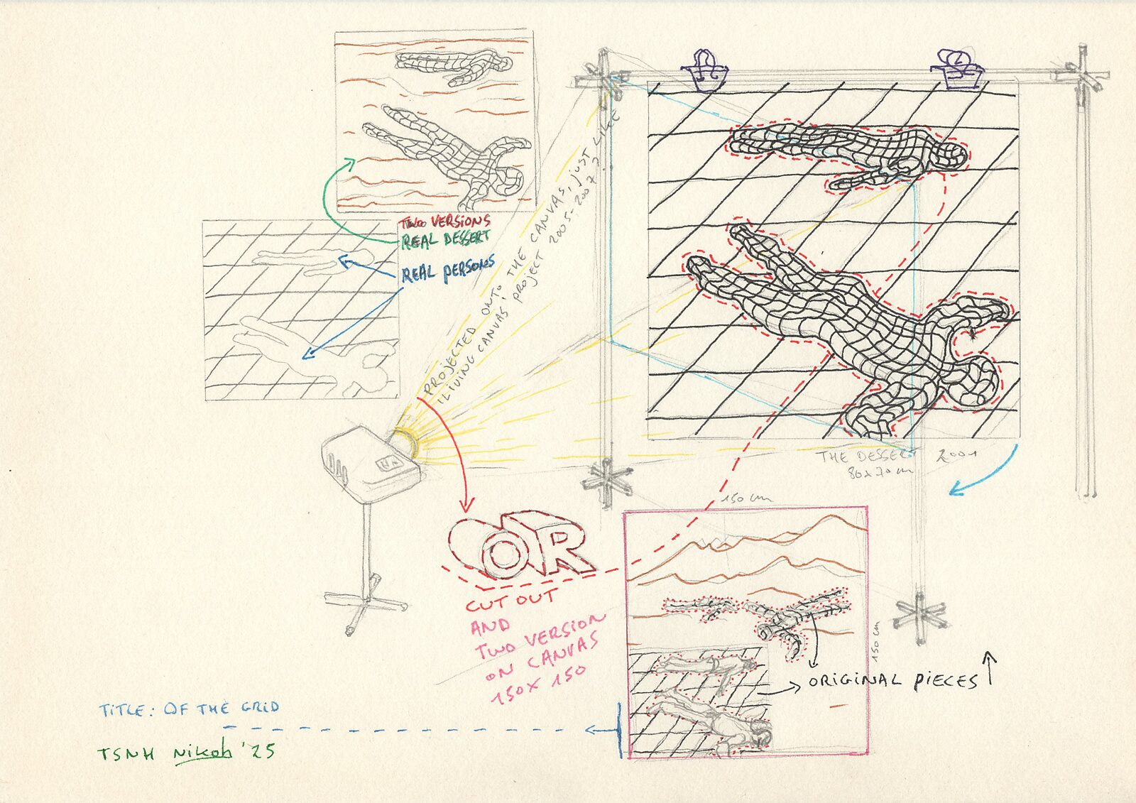 Aan het project Virtuele rasters (gestart in 2001) voeg ik nieuwe transformaties toe, met als vertrekpunt de verwerking van het doek De woestijn (2001). Dat breng ik samen met een tweede doek waarop, door het gebruik in mijn atelier, al sporen van transformatie zichtbaar waren.