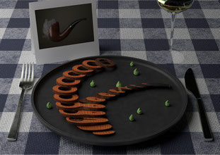 Gerookte Magritte combineert een foto, een 3D-animatie en een fictieve menutekst tot een speels surreëel geheel waarin Magrittes iconische pijp zichzelf letterlijk rookt en als culinair gerecht wordt opgediend — een humoristische wisselwerking tussen taal, beeld en smaak.