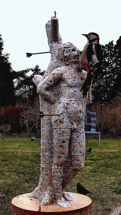 Vreemde hond op de hondenshow bestaat uit een inox draadstructuur die werd bedekt met een rozig deegmengsel. Het deeg — gemaakt van gist, bloem en water — begon te rijzen, waardoor het volume toenam en de hond steeds voller en vetter leek te worden.