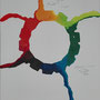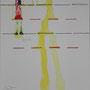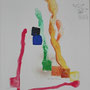 Soms gebruikte ik extra elementen om het proces te beïnvloeden. Op het doek noteerde ik hoeveel blokjes ik gebruikte en welke handelingen ik toepaste. De kleuren zijn helder en precies, al blijft het doek zelf wit en dus lichter dan de foto’s suggereren.