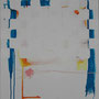 Met een siliconenmal vervaardig ik kleine, vierkante ijsblokjes (5 × 5 × 3,5 cm) die ik kleur met acrylverf. Ik plaats één of meerdere blokjes op het doek, wacht af, observeer wat er gebeurt en laat de verf haar werk doen.