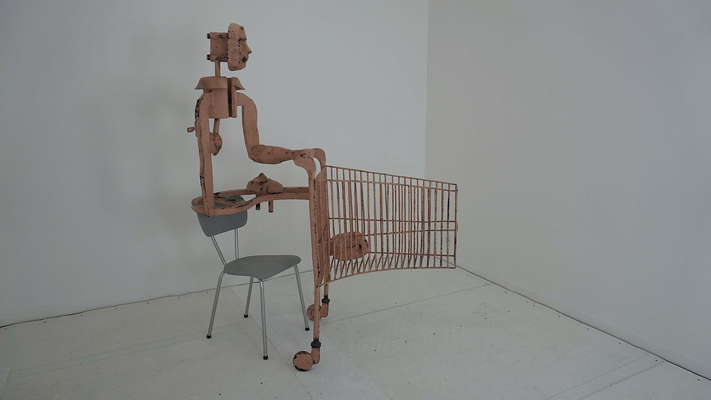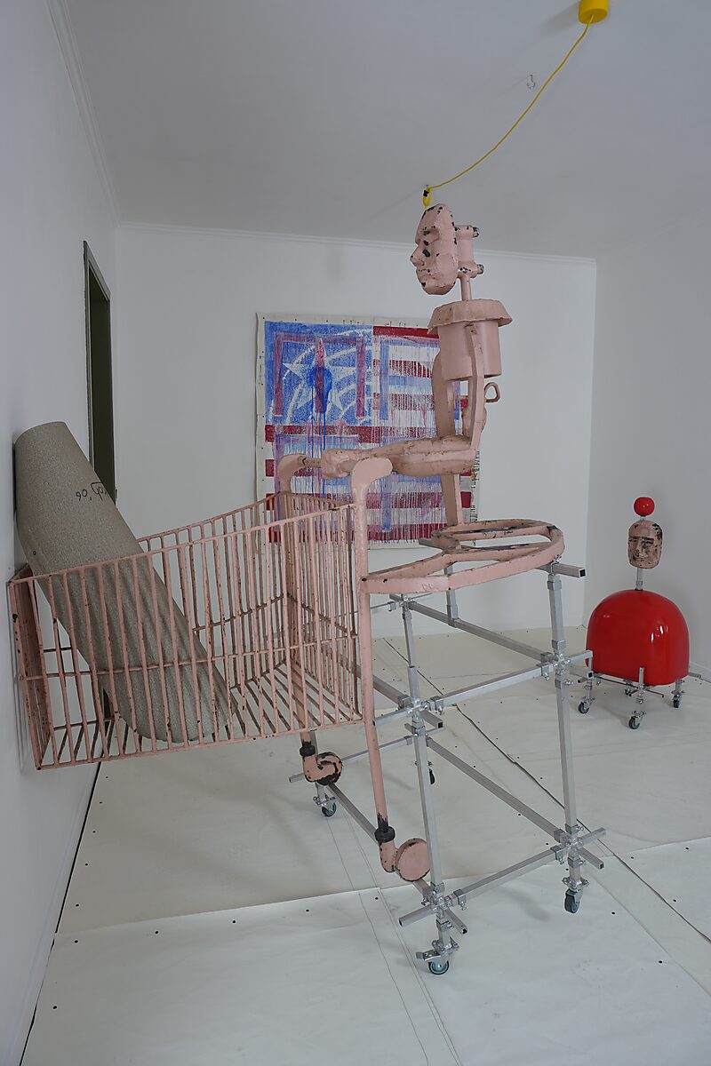 A figure with a shopping cart literally goes out to buy other faces. The work plays with the idea that people can put on a different face depending on the situation. The faces on the sculpture can be swapped.