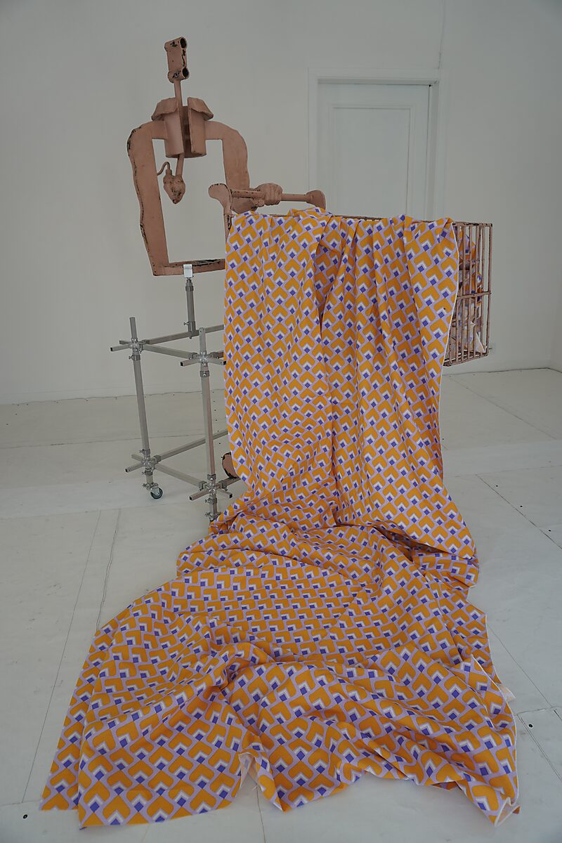 The aluminum construction system was removed and replaced with a setup in which a chair supports the sculpture.